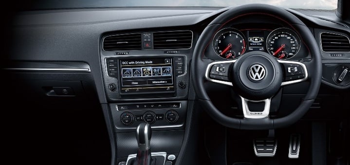 また、標準のゴルフGTIにはオプションだった電子制御式サスペンションシステム、アダプティブシャシーコントロール“DCC”も標準装備された。DCCは、ダンパーの減衰力や電動パワーステアリングの特性を瞬時にコントロールできる機能をもつ。ドライバーは、スイッチひとつで、「ノーマル」「コンフォート」「スポーツ」と3つのドライビングモードから選択できるようになった。つまり、自分の好みやシチュエーションにより、快適な乗り心地とパフォーマンス重視というサスペンション設定が自由に選べるのだ。こうしたシャシやブレーキ性能の向上により、タイヤ&ホイールも1サイズ以上アップとなる225/35R19が装着された。