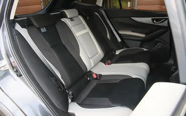 VN型レヴォーグのリアシートは4:2:4の分割可倒式だ。前後着座間隔は先代モデルより+25mm、リアシート座面長を+18mm延長することで、長時間の乗車でも疲れない快適な居住スペースを実現した。