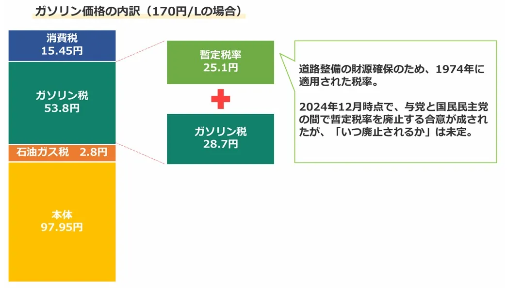 10円/Lの引き下げより、暫定税率廃止のほうがガソリン価格の引き下げ効果は明らかに大きいです。また、2024年12月に与党は国民民主党との協議で暫定税率の廃止に合意しています。