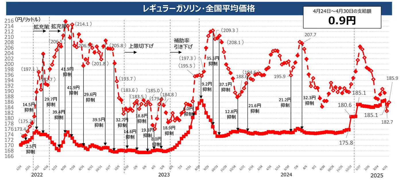 長期の補助金支給による財政圧迫や外交面への配慮から、2024年12月には補助金の縮小が決定。2025年4月末現在は、全国平均ガソリン価格が185円を超える場合に超過分への補助が行われています。