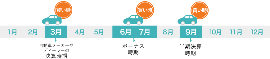 中古車でも、時期によって目玉商品が出たり、普段より値引きを引き出しやすくなったりします。特にクルマ業界の決算期とされる3月は値引き交渉に応じてもらいやすく、かつ引越しや車検も多い時期でクルマの買取も増えます。