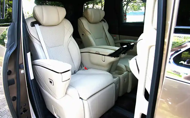 Vクラスは存在感も抜群。ボディ前面のエンブレムが大きく輝いています。3列目も1人ずつシートがしっかり確保されていますので、常時7~8人で乗る人におすすめです。