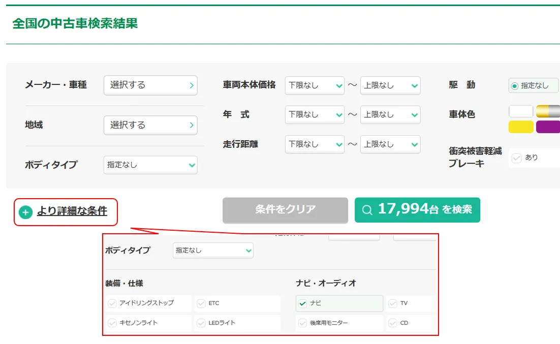 中古車でもナビを搭載している車両は多数あります。例えばガリバーの場合、2023年8月下旬の時点でナビ付きの車両は在庫の約半数に上ります。詳細検索でナビ付きの車両を探すこともできるので、検索してみてください。