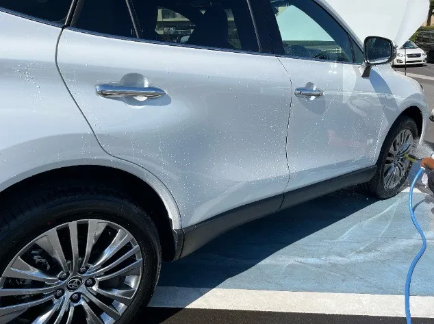 はじめに、クルマに付着した汚れを水圧で流します。クルマを傷つけず黄砂や花粉の汚れを落とすためには、このステップが最も重要です。