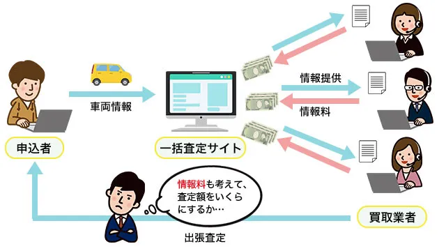 一括査定サイトに登録している買取業者は、情報提供の見返りとして一括査定サイトに情報料を支払います。情報料は1車両あたり2,000~3,000円ほどで、これはその後、車を買い取れなかった場合も支払わなければいけません。一括査定では、こうした情報料の支出分が査定額に反映されていることも多いのです。