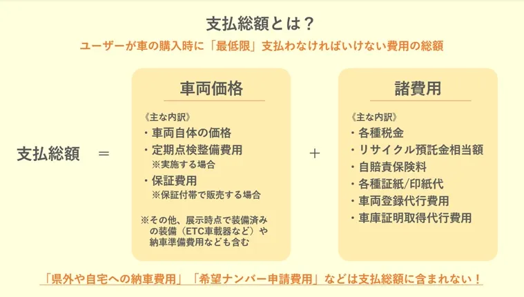 中古車の支払総額とは、車両の購入に際して最低限かかる費用の総額であり、車両価格と諸費用から成ります。