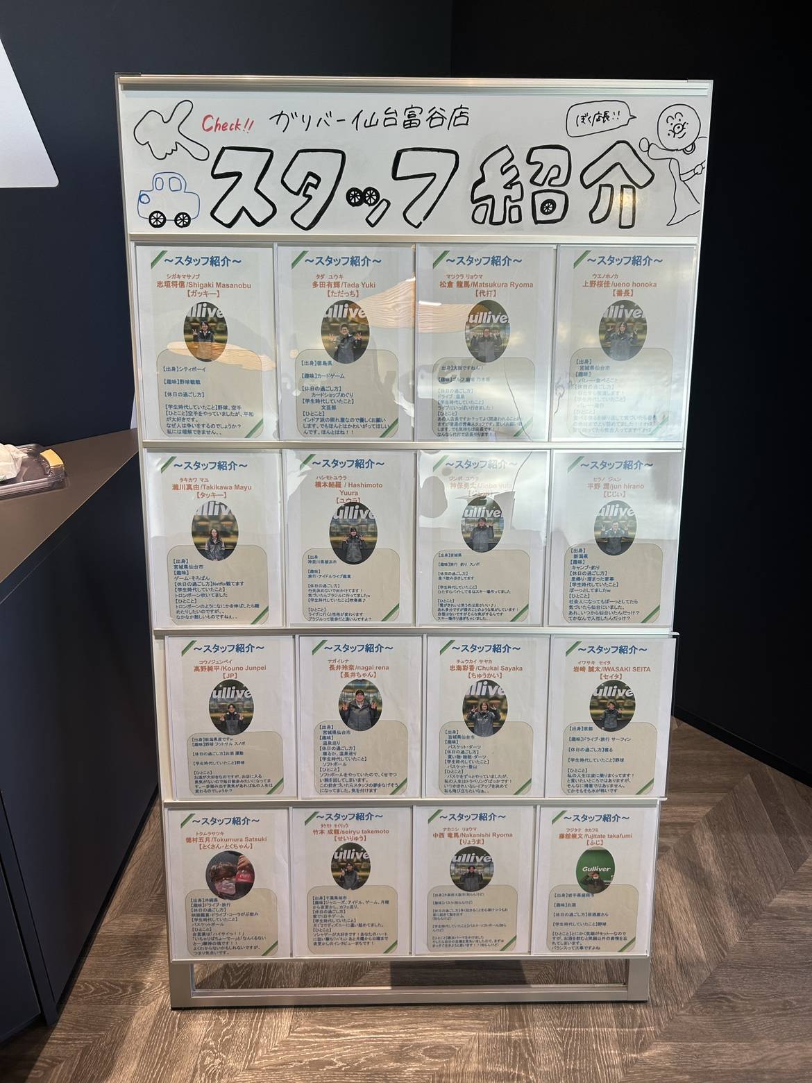 上野のスタッフページを見るこんにちは!ガリバー仙台富谷店の上野です!本日は店舗に設置してある【スタッフ紹介】のご案内です♪ガリバー仙台富谷店にはこんなに綺麗でオシャレなカフェテリアがあるんです!↑ ↑まだまだ寒い日が続いていますが、そんな日にぴったりなホットコーヒーもご用意していますので、店内でごゆっくりお過ごしいただけます。そんなカフェテリア中にあるのが、【スタッフ紹介】です!スタッフの氏名、ニックネーム、趣味、休日の過ごし方など、、、最後の『ひとこと』はひとりひとり個性出ていて、かなり興味引く内容になっています!!ぜひご来店いただいた際にはカフェテリアをご利用いただき、ドリンク片手にご覧ください!!!ご来店お待ちしております!!!